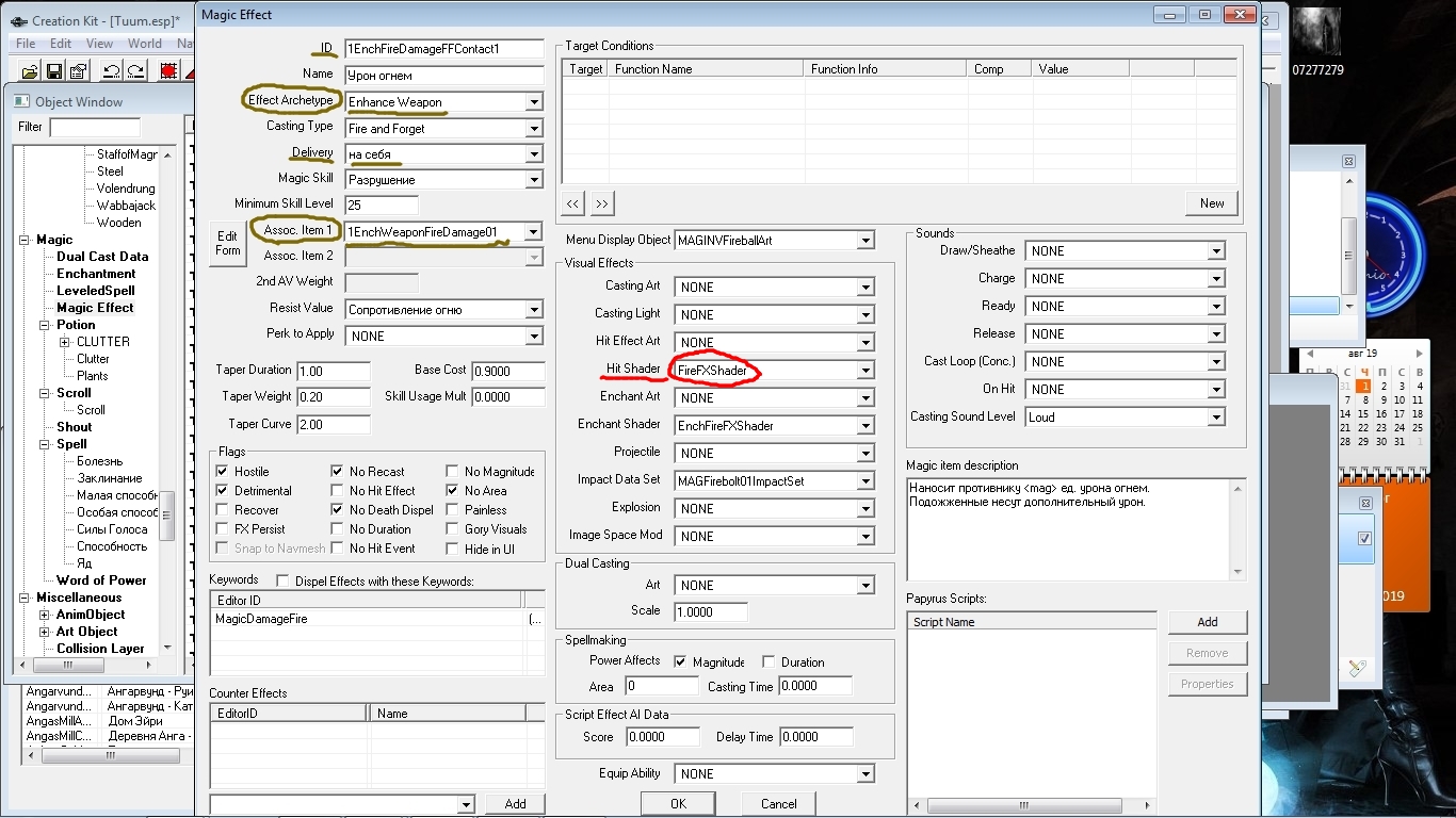 Для этого я перехожу во вкладку Object Window - > Magic - > Magic Effect и нахожу эффект для оружейного зачарования Урон огнем (EnchFireDamageFFContact) и меняю ему ID (рекомендуеться.)