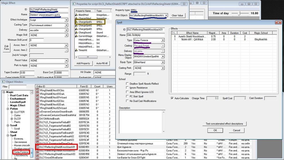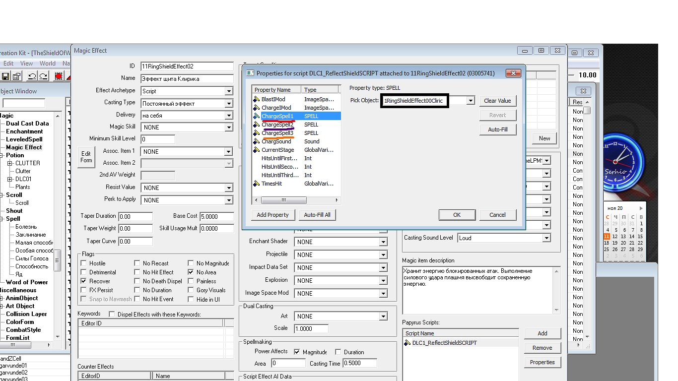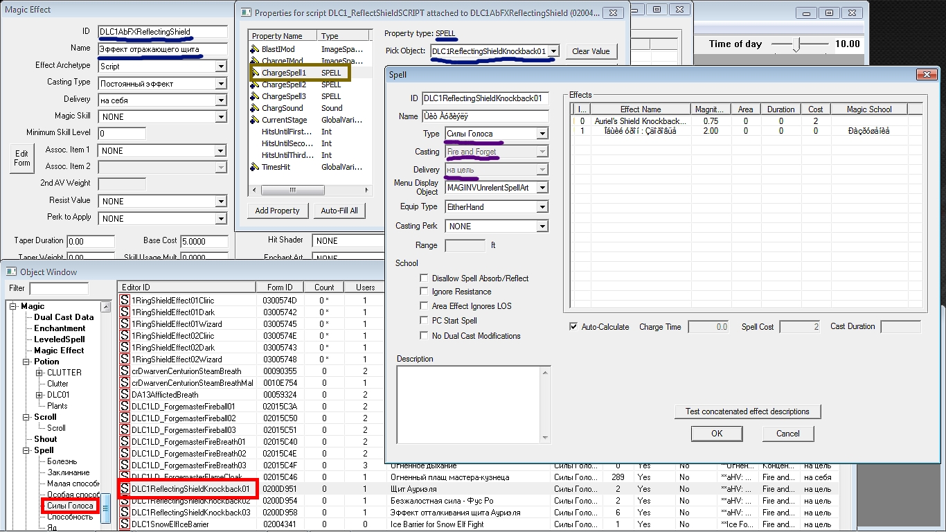 В разделе Scripts раскрываем указанный в нем скрипт - DLC1_ReflectShieldscript и в открывшемся окне Property for Script смотрим строчку ChargeSpell1 (она выделена золотым) - в ней указан Spell - DLC1ReflectingShieldKnockback01