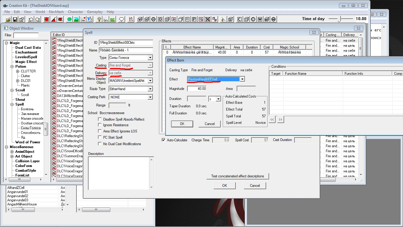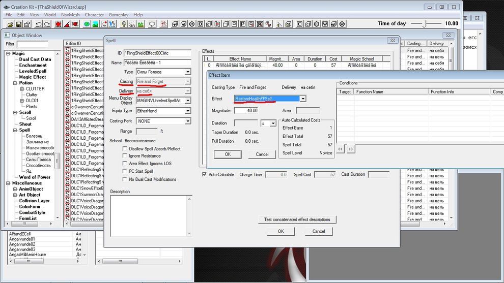 Перейдя по пути: Object Window - > Magic - > Spell - > Силы Голоса мы находим этот спелл (выделено красным) и, раскрыв его, увидим параметры его эффекта (они выделены фиолетовым)