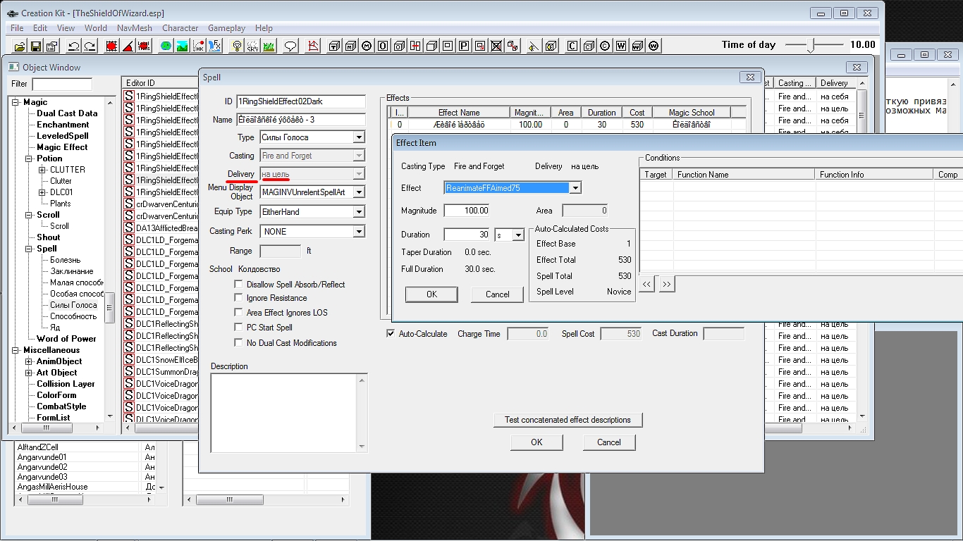 Переходим во вкладку Object Window - > Magic - > Spell - > Силы Голоса и откроем любой из Spell'ов Щита (DLC1ReflectingShieldKnockback01, DLC1ReflectingShieldKnockback02 или DLC1ReflectingShieldKnockback03) и смотрим на рис. 2
