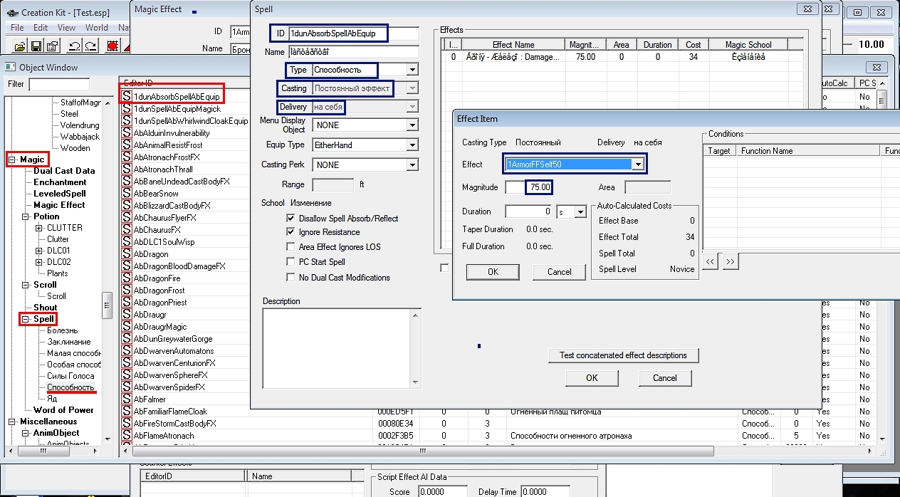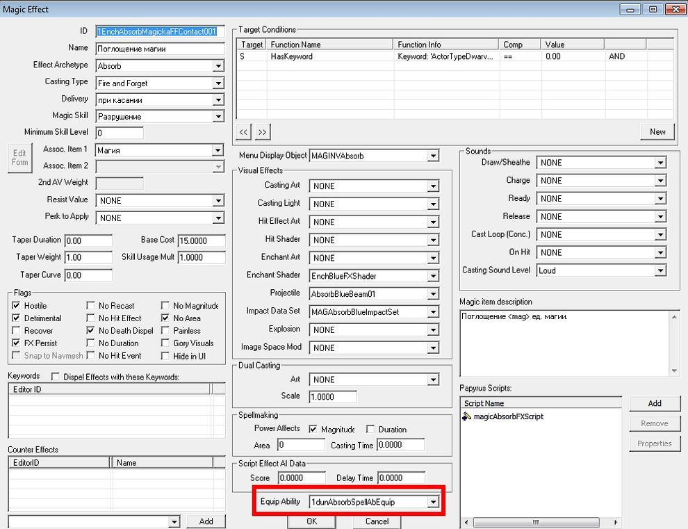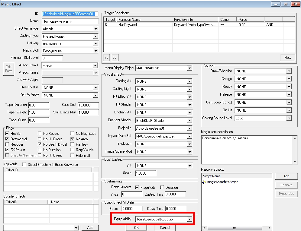 Сохраняем нашу новую Способность. Осталось только добавить свежесозданную Способность в Оружейный эффект, в графу "Equip Ability". (переходим в Object Window - > Magic - > Magic Effect, находим эффект "Высасывание магии" и указывем ID новой способности как на рис.3 (у меня это - 1dunAbsorbSpellAbEquip))