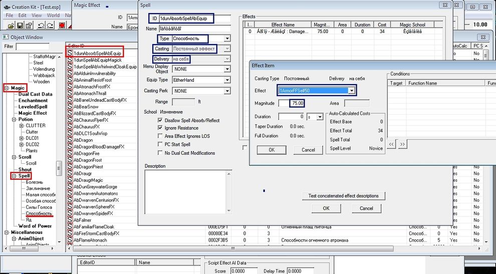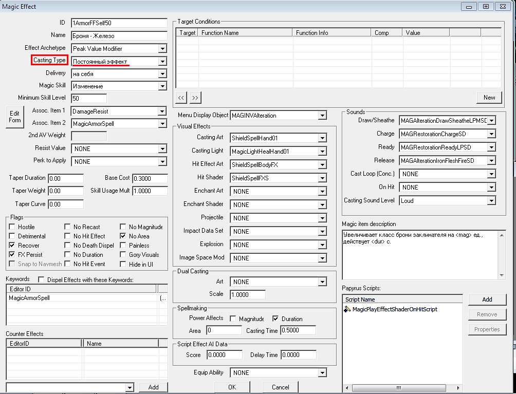 Type, Casting и Delivery - остаются без изменений. В части "Effects", в открывшемся окне "Effect Item" мы указываем ID нашего эффекта Магической брони (у меня это - 1ArmorFFSelf50)