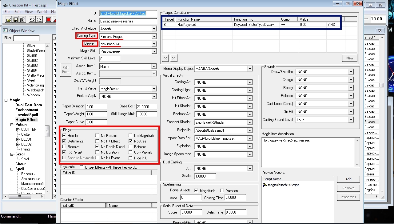Сначала перейдем в Object Window - > Magic - > Magic Effect и откроем сам магический эффект "Высасывание магии" (рис. 1)
