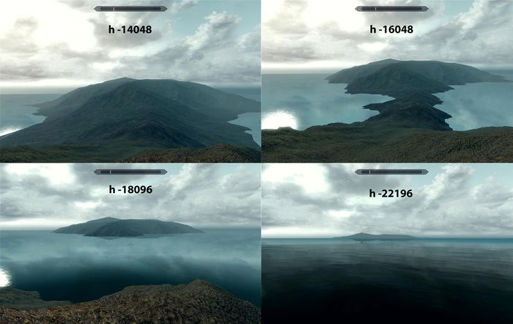 При рисовании мира, хорошо бы знать, где будет находится уровень воды. Когда я рисовала свою карту высот в 100-2% оттенка серого, уровень воды будет между 89% и 90% оттенков серого. (Это значение будет позже изменено на 99-98%, когда я буду понижать оттенки до такого состояния, чтобы Skyrim мог их обработать.)