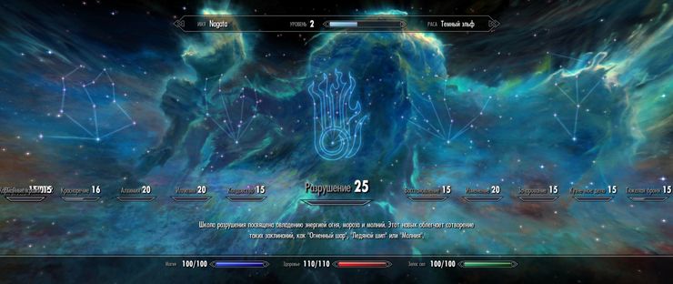 Характеристики из предыдущих игр Elder Scrolls ( к примеру, сила, интеллект и т.д. ) не вошли в систему Скайрима.